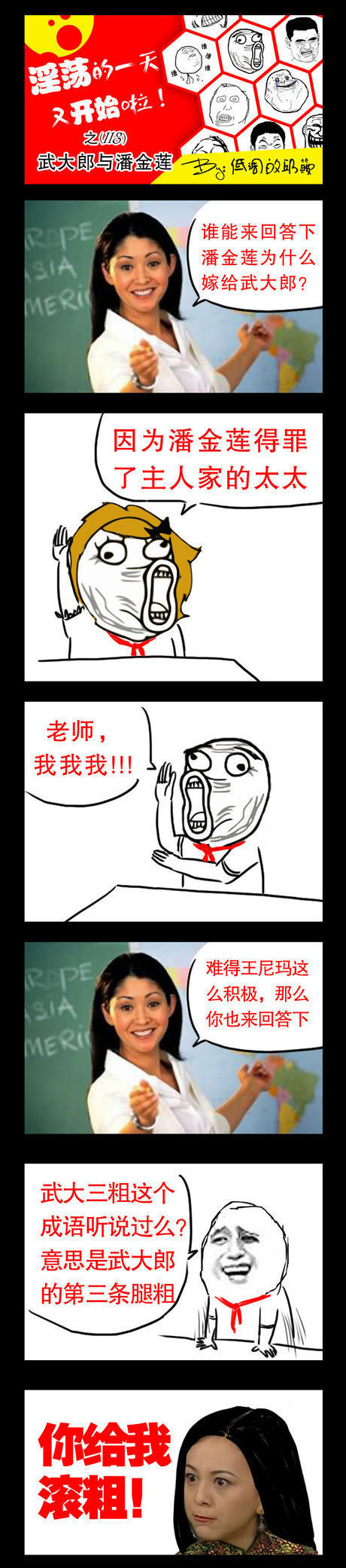 小伙伴们,你们知道潘金莲为什么会嫁给武大郎吗?你们能知道吗?你们想知道吗?今天小编为大家带来的是一组,淫荡的一天又开始啦系列之武大郎与潘金莲。在课堂上,老师就有提问这个问题,尼玛很积极的抢答,但殊不知,被老师恶狠狠的赶出教室。小伙伴们你们想知道正确答案吗?你们又想知道尼玛做出了怎样的回答吗?话不多说,想知道的童鞋们,就感觉来看看这组,淫荡的一天又开始啦系列之武大郎与潘金莲暴走漫画吧!