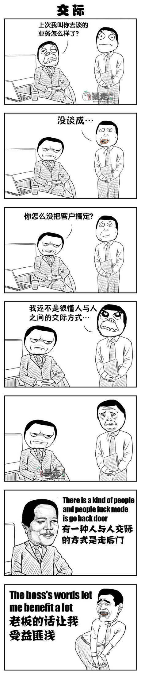 在人与人的交际之中,沟通是很重要的。今天呢小编为大家带来的是一组暴走漫画之交际,在今天的这组暴走漫画之交际中呢,尼玛在一家公司上班,由于个人的交际能力问题,未能完成上级交配的任务。于是呢,领导就给尼玛支了一招。小伙伴们你们想知道尼玛的领导给尼玛支的是什么“烂”招吗?话不多说,就让我们一起来看看这组暴走漫画之交际吧,看完编制啦!