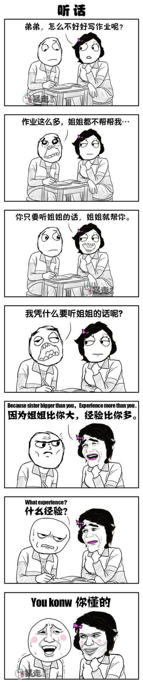 各位童鞋们,当你们不听话时,你们的家长或者老师都是怎样教导你们的呢?虽然每个人的教导方式都不一样,但是小编觉得吧,大人好像永远都觉得自己有理。今天呢,小编为大家带来的是一组暴走漫画之听话。话不多说,接下来,咋们就一起来看看,当尼美的弟弟不听话时,尼美是怎样教导她的弟弟的吧。