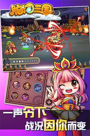《脑洞三国》以著名的三国历史为游戏背景,玩家化身一国君主,谱写一曲搞笑三国志。数百三国人物变身娇兵萌将等你招募,无厘头造型让人直呼脑洞大开;带领作战小分队争霸天下,N多三国战役由你改写历史;无敌强化打造最强武将,神兵利器一骑当千;创建军团寻找盟友,远交近攻横扫四方。脑子不够用,处处都是洞,神也挡不住的最笑三国志。《脑洞三国》,等你来战!