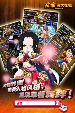 女帝:海贼王是一款RPG卡牌策略手机网游,游戏是以超人气动漫海贼王为题材,集英雄收集、船员布阵、装备宝物、竞技等玩法于一身,重现了原著中的海贼世界。在无尽之海的无风地带,有位实力强大的女皇帝统治着这片海域。简单而又真实的手动战斗模式使得战斗的乐趣大大提升,不再有静静看着动画等待战斗结束的无奈和枯燥。丰富的养成与活动系统也不会让人在整体游戏过程中觉得无聊。如果你已经厌倦了自动战斗的游戏,不妨进入女帝:海贼王体验一下全新战斗模式,你一定会对这款游戏爱不释手。