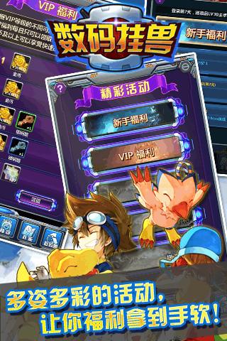 《数码挂兽》来袭!激起你无限的回忆!快来和数码怪兽们一起来并肩作战吧!作为一款放置类挂机RPG手游,你完全不用手动打怪,你创建的角色从进入游戏开始就会不停地自动打怪,经验升级、获得金币、掉落装备都是自动的,即使离线退出游戏都不会停止!游戏还有超萌的数码兽,超炫酷的武器,都等着你来收集、培养、升级!单人竞技、多人团战、公会系统、多彩活动,赶快来体验吧!